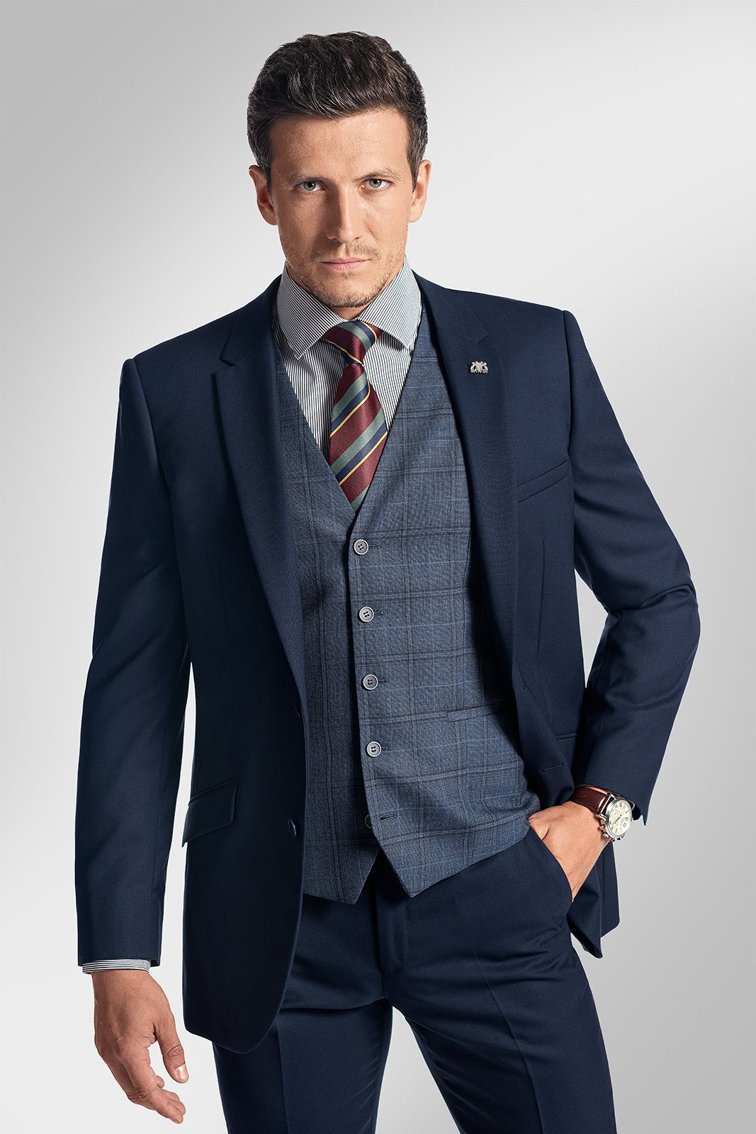 Tmavý oblek BANDI s kostkovaným vzorem window pane skvěle doladí kontrastní kravata