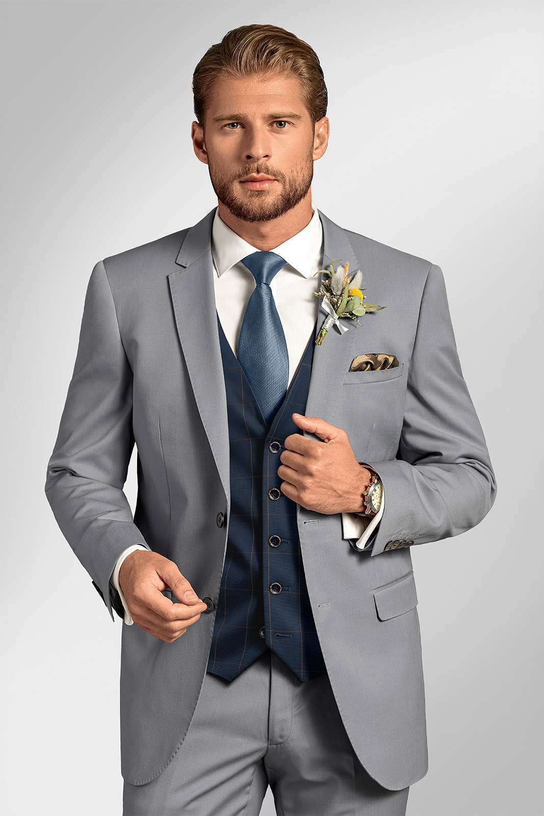 Rozjasněte svůj svatební den originálním oblekem BANDI Estatio. Jeho jedinečná světle modrá látka v odstínu letní oblohy přímo vybízí k tvorbě kreativních stylingů. Skvělý dojem v něm zanecháte na tradiční svatbě i při obřadu na rozkvetlé louce v oblíbeném boho stylu.
