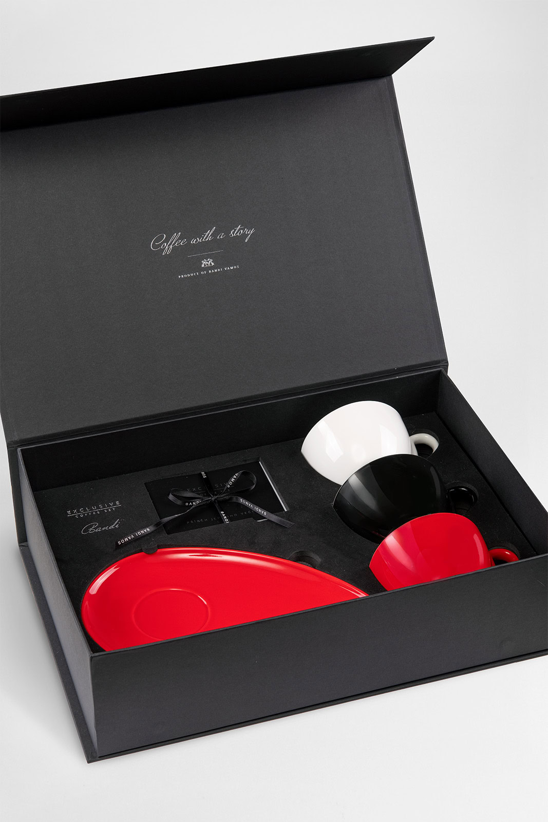 - Porcelánový set BANDI na kávu – sada tří šálků s podšálky v barevné kombinaci bílá, červená a černá. A dvou velikostech: menší šálky (80 ml) a větší (250 ml).