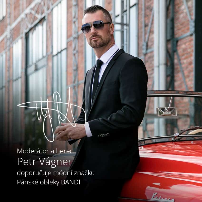 Moderátora a herce Petra Vágnera obléká módní značka Pánské obleky BANDI
