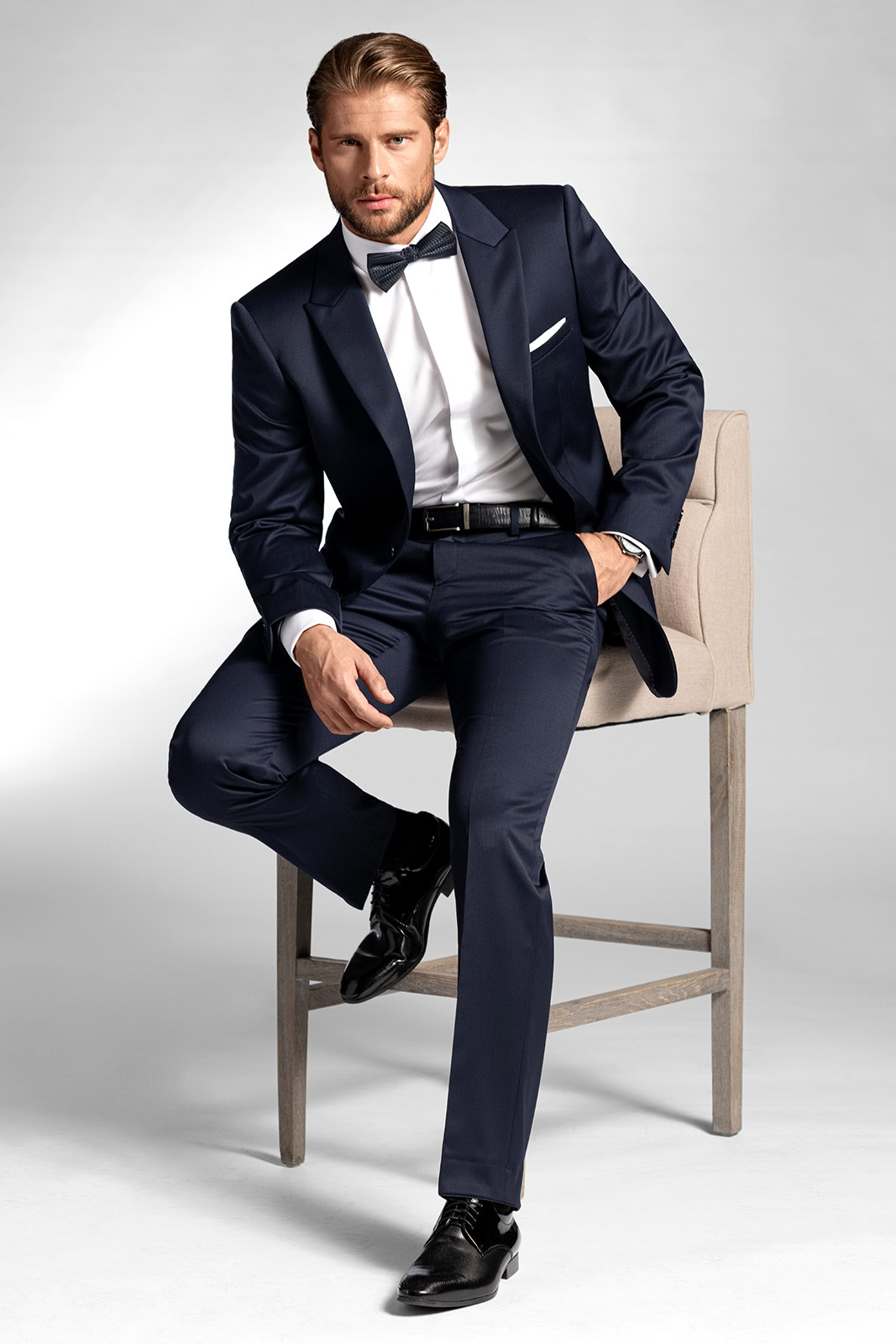 Černý smoking je vrcholem mužné elegance. Vhodný na ty nejformálnější události, které se řídí přísnými pravidly pro výběr oblečení. Motýlek, smokingový pás a kapesníček jsou nejen povinnou součástí outfitu, ale i symbolem slavnostního stylu a úcty k výjimečným příležitostem.