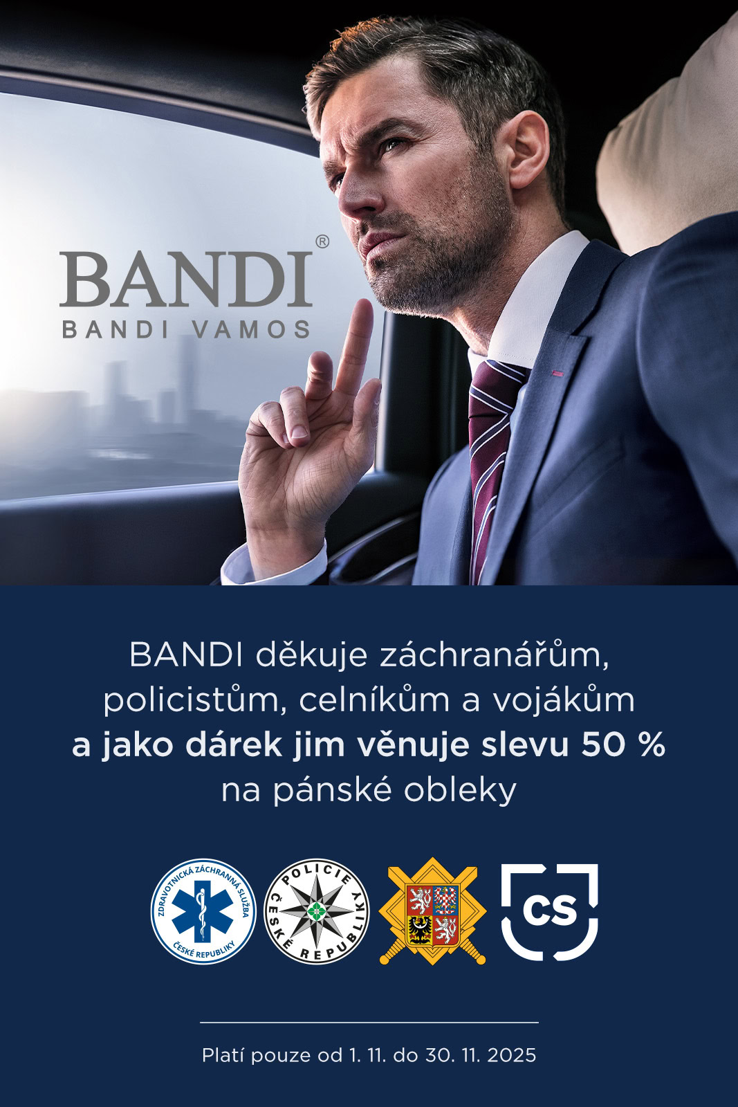 Příslušníci, členové a zaměstnanci složek IZS a Armády ČR mají možnost využít tento dárek a nakoupit od soboty 1. listopadu do středy 31. prosince 2025 ve všech prodejnách BANDI vybrané modely pánských obleků se slevou 50 %.