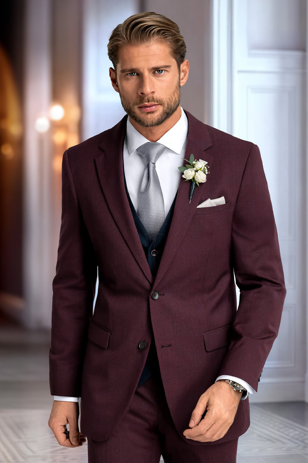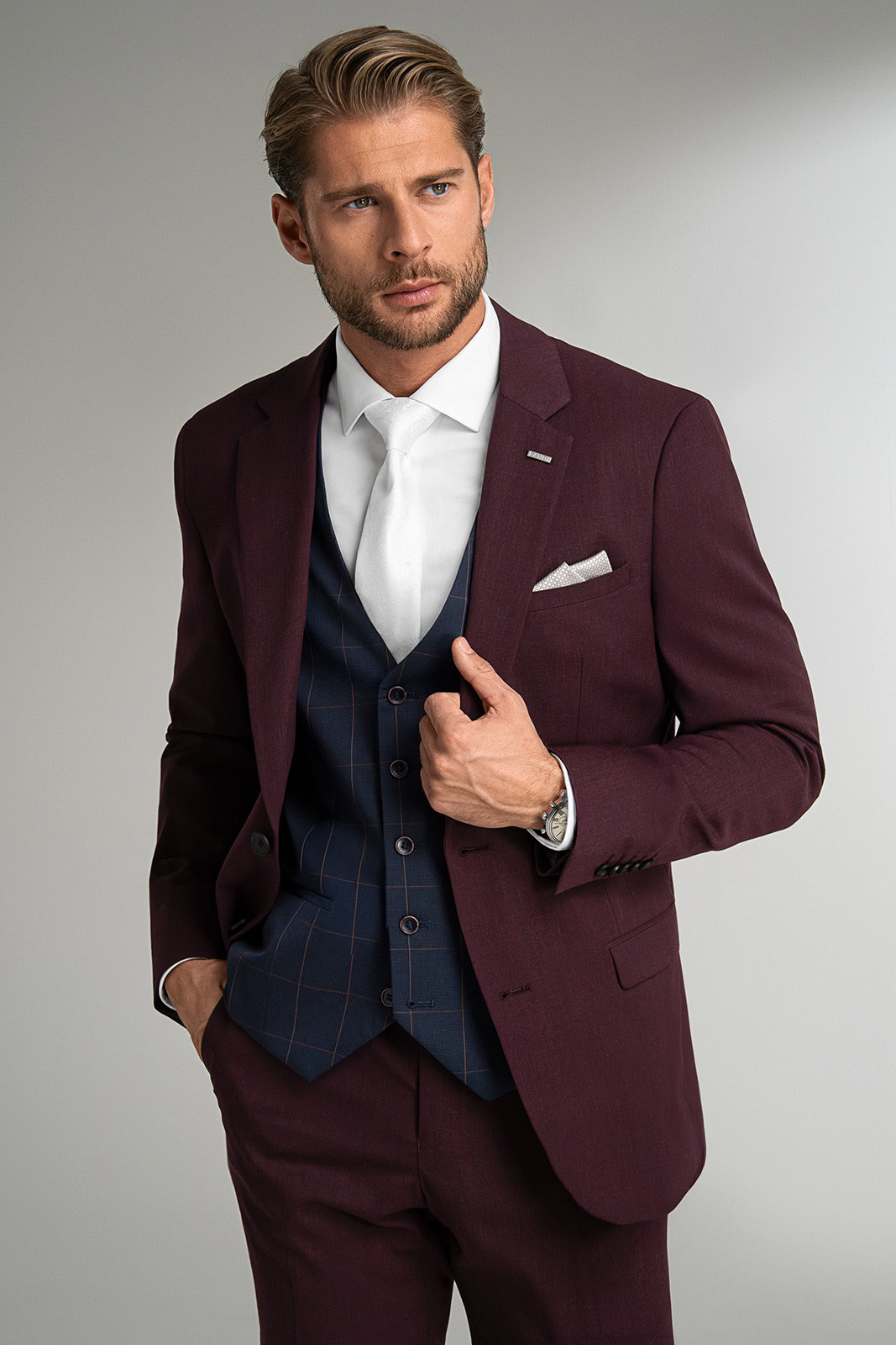 Oblek Arcenito v tmavém odstínu bordó je skvělou volbou pro ženicha, který chce zaujmout neotřelou elegantní kombinací. Doplňte jej noblesní bílou košilí s dvojitými manžetami, bílou kravatou a tmavou vestou. Získáte tak jedinečný svatební outfit pro dokonalý dojem.