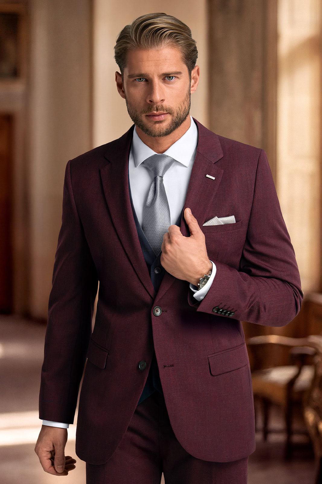 Oblek Arcenito v tmavém odstínu bordó je skvělou volbou pro ženicha, který chce zaujmout neotřelou elegantní kombinací. Doplňte jej noblesní bílou košilí s dvojitými manžetami, bílou kravatou a tmavou vestou. Získáte tak jedinečný svatební outfit pro dokonalý dojem.