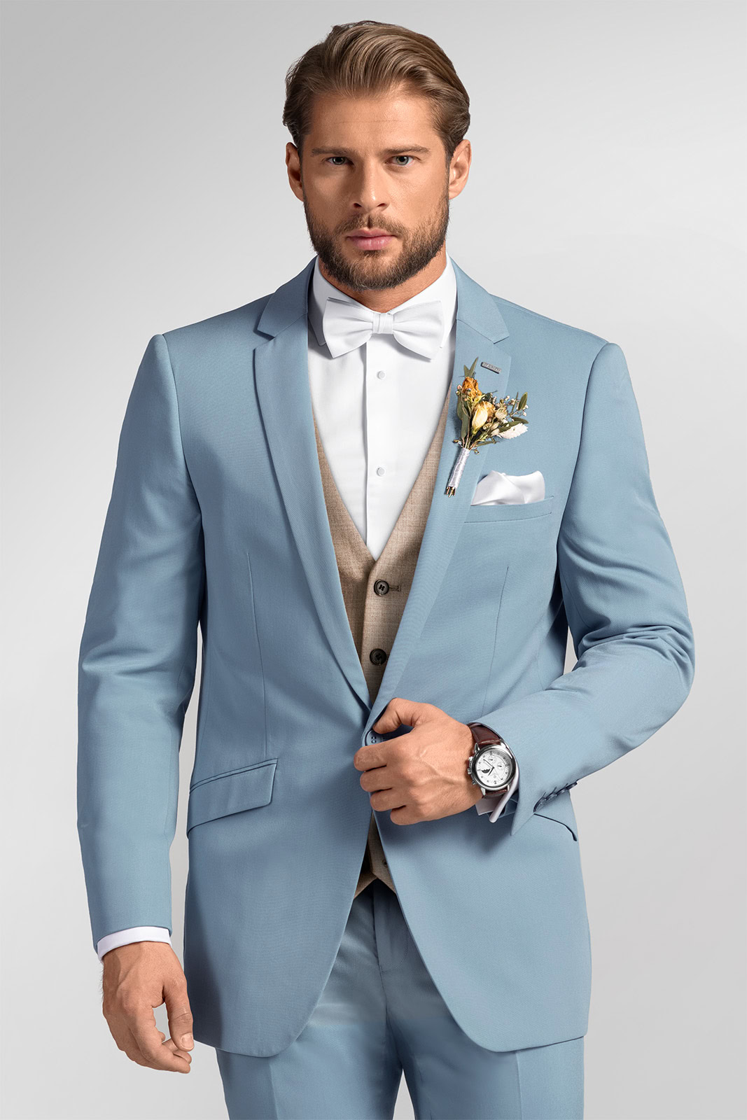 Rozjasněte svůj svatební outfit originálním oblekem BANDI Estatio. V klasickém stylingu spolu s bílou košilí a slavnostní kravatou si zachovává vysokou formálnost na tradiční svatbu. Jeho světle modrý odstín přímo vybízí k tvorbě kreativních outfitů na netradiční svatby pod širým nebem nebo v oblíbeném boho stylu.