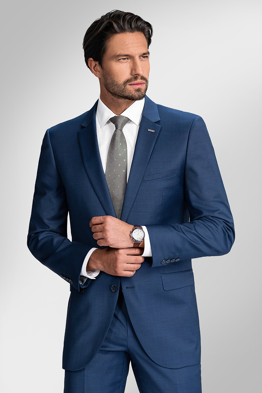 Prvotřídní látka s vyváženým podílem nejjemnější vlněné příze a moderních vláken zajistí maximální komfort pro každou příležitost během celého roku. Oblíbený střih Tailored Fit ocení především muži standardní a štíhlé postavy s vysokými nároky na kvalitu a styl svého oblečení.