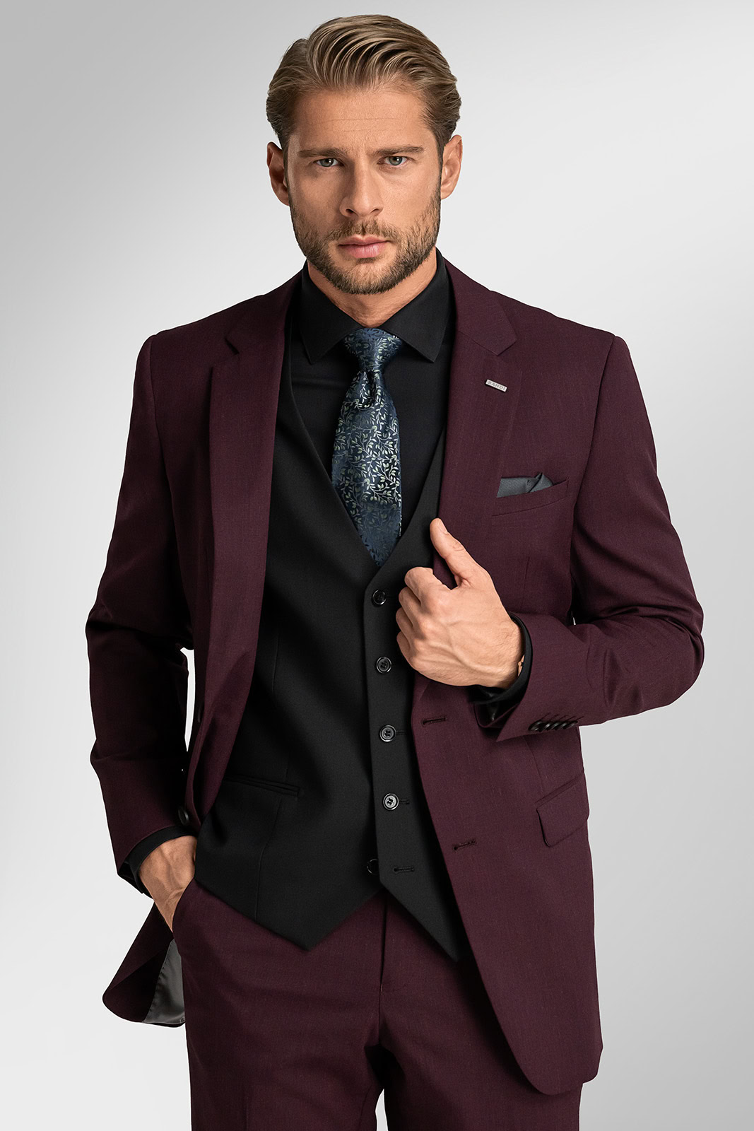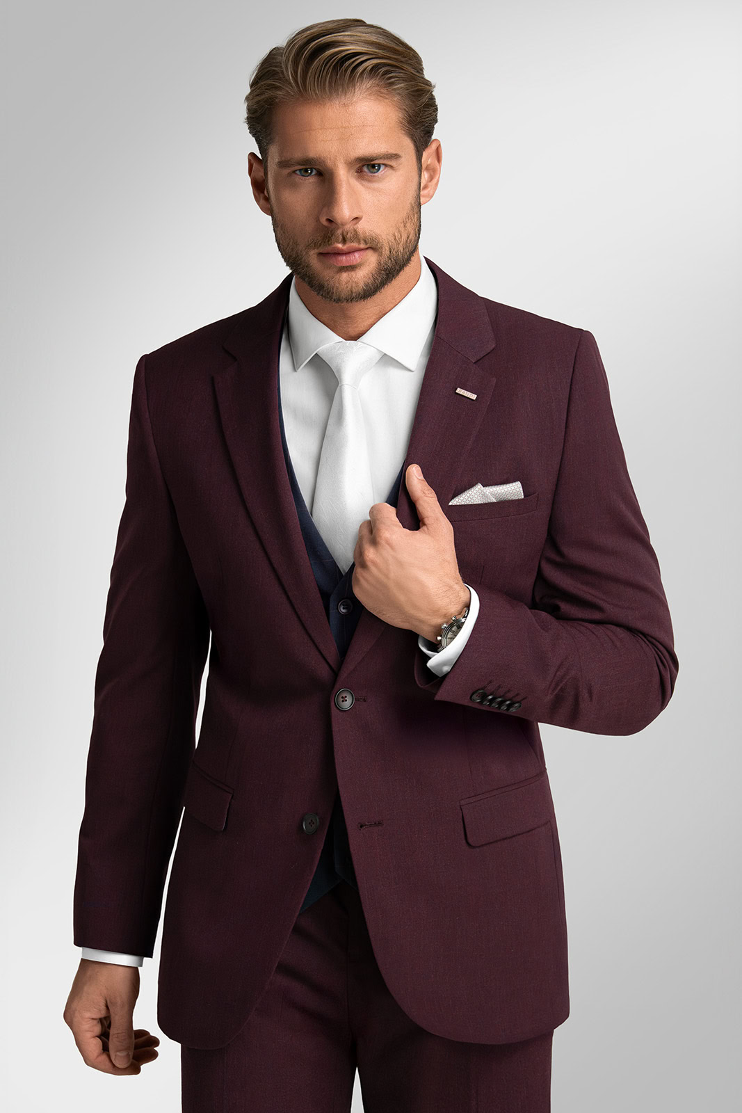 Chystáte svatbu? Oblek BANDI Arcenito v atraktivním vínovém odstínu je perfektní volbou pro ženicha, který chce zaujmout neotřelou elegancí a osobitým stylem. Doplňte jedinečný model slavnostní bílou košilí, kravatou a stylovou kontrastní vestou pro správný dojem.