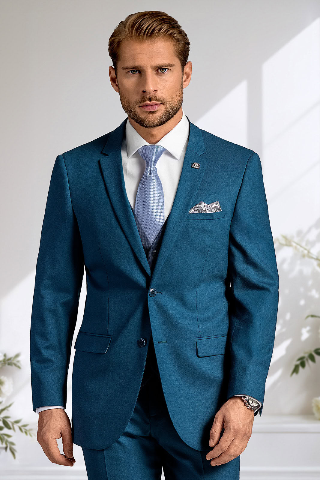 Blankytně modrý oblek BANDI Estatio působí svěže a výrazně. Proto si žádá spíše střídmé doplňky. V případě, že si ženich zvolí klasický tmavý oblek, měli byste si jako svědek nebo svatebčan obléknout tmavší, méně nápadný model, abyste jej nezastínili.